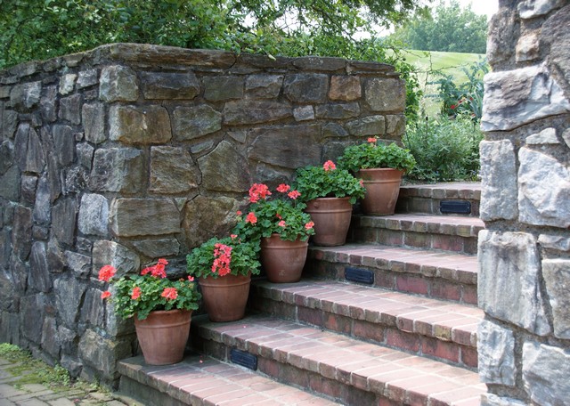 - Long steps made of materials like slate or brick can be broken by informal planting.